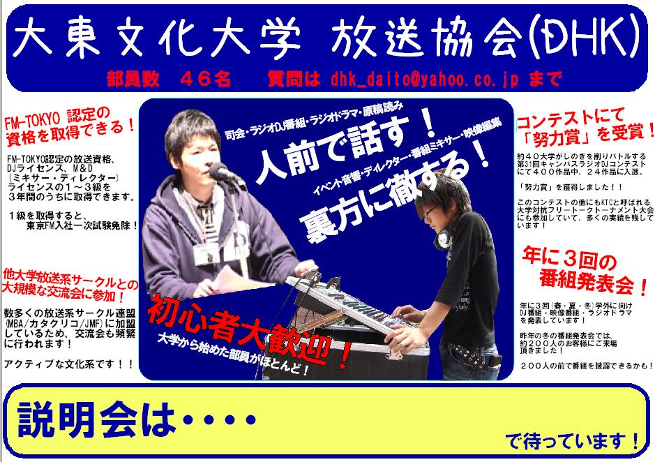 DHK(大東文化大学放送協会)の部員が更新するブログです!活動や番発、飲み会やラーメンの事まで。とくとご覧あれ!